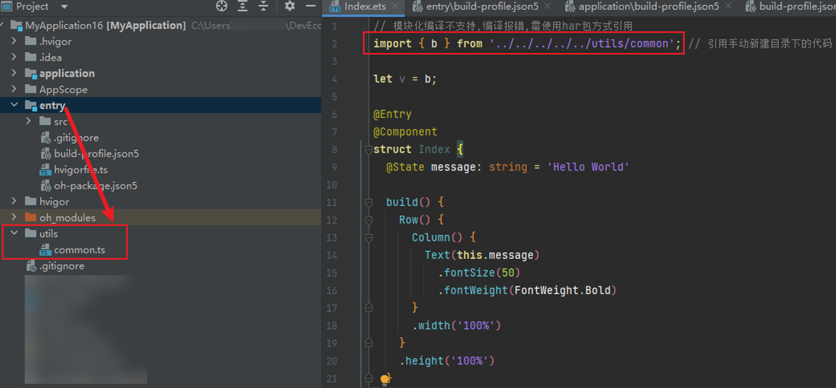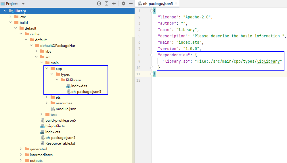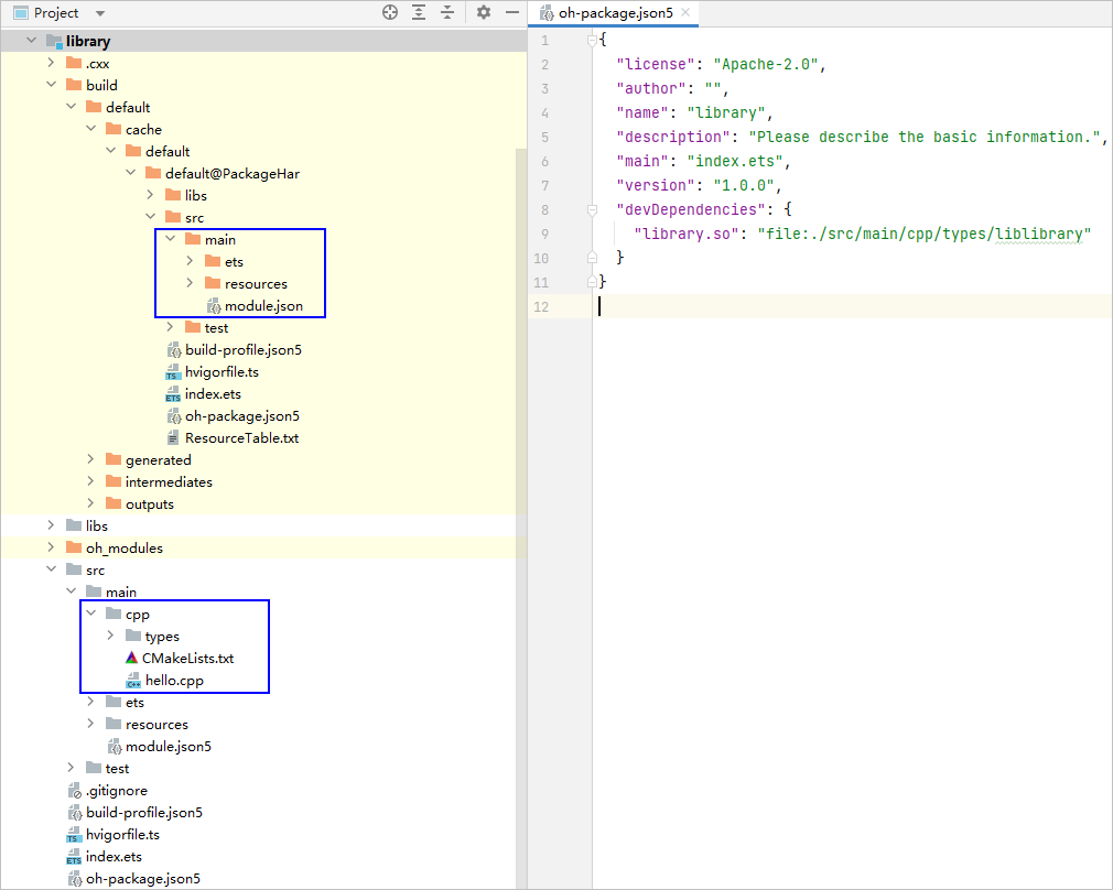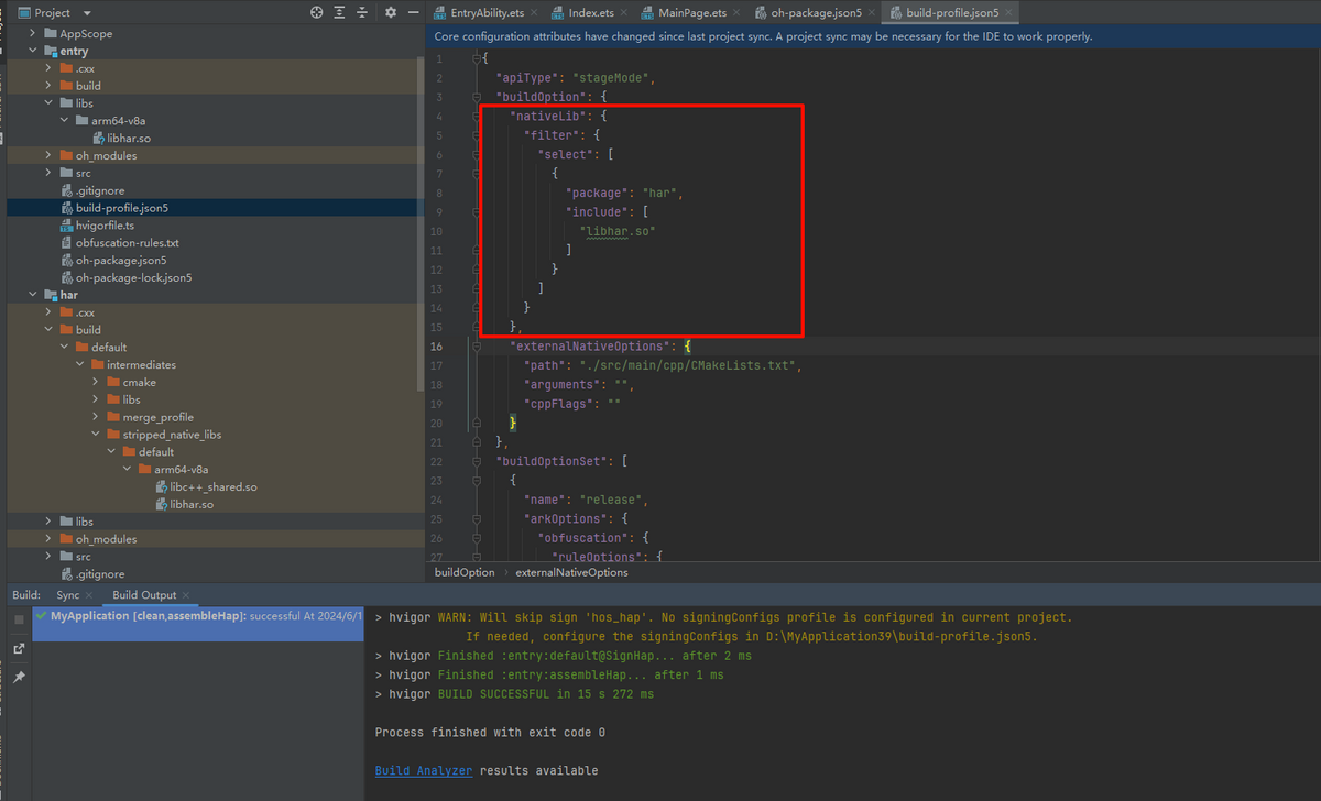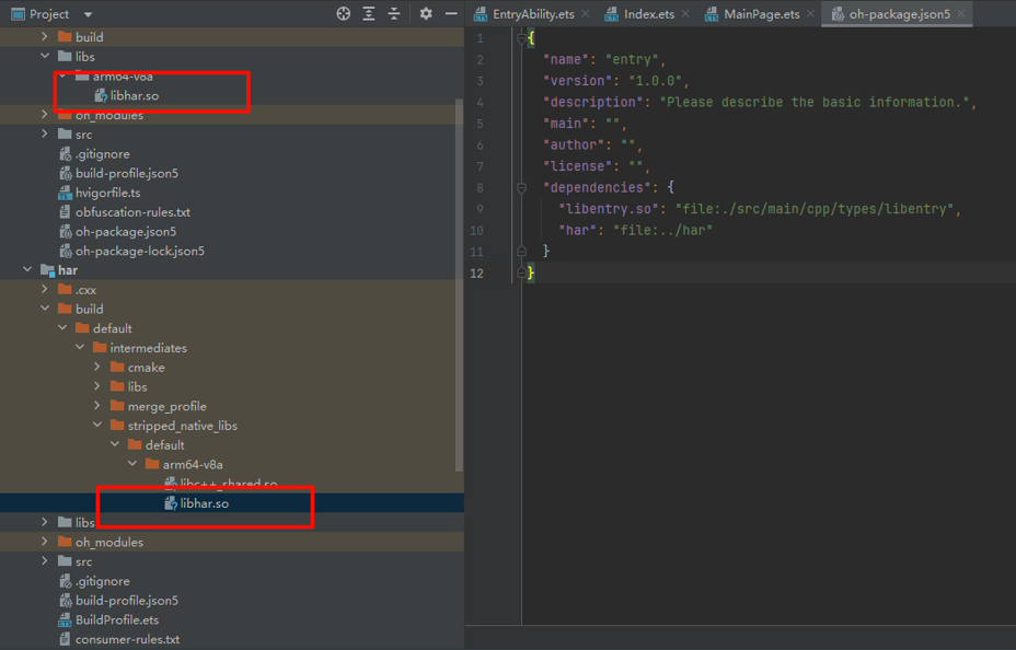 基于上面的例子,可以在entry的build-profile.json5中添加配置select选中har模块中的so文件,package选中包名为“har”的模块, include选中“libhar.so”文件。