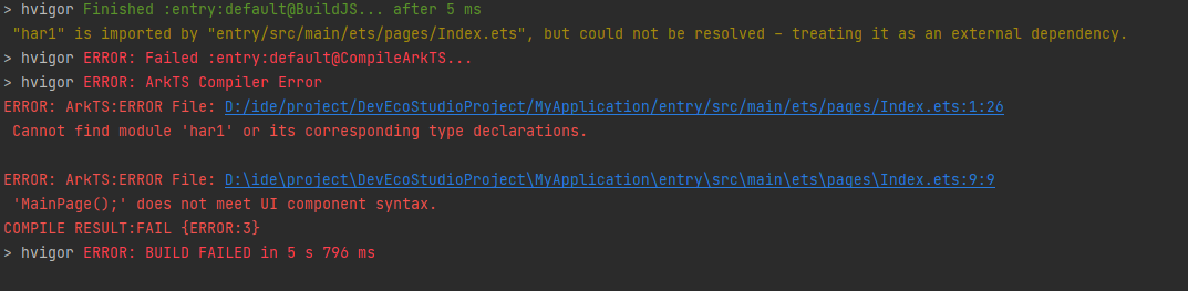 问题原因是构建时存在不同版本的同名so文件。比如将har模块产物里的so文件拷贝到entry模块的libs目录下,这时har模块里有一个libhar.so,entry模块里也有一个libhar.so,再配置entry依赖har,构建entry就会出现报错。