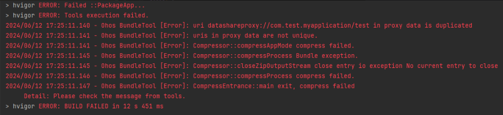 打包APP时,提示“uri datashareproxy://bundleName/** in proxy data is duplicated”。
