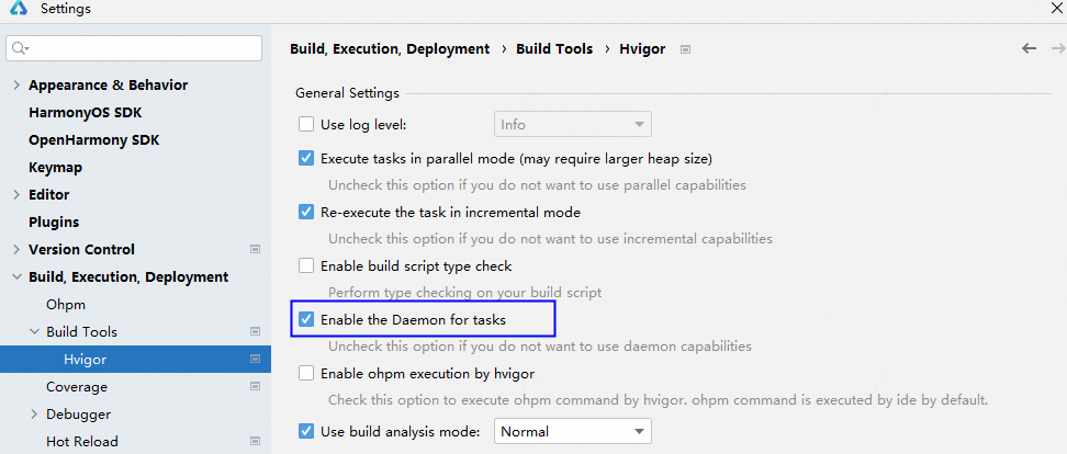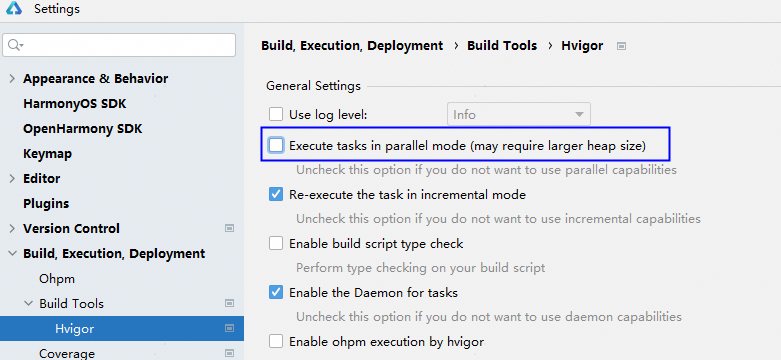 在菜单栏点击“File > Settings(macOS为DevEco Studio > Preferences/Settings) > Build, Execution, Deployment > Build Tools > Hvigor”,取消勾选“Execute tasks in parallel mode (may require larger heap size)”。
