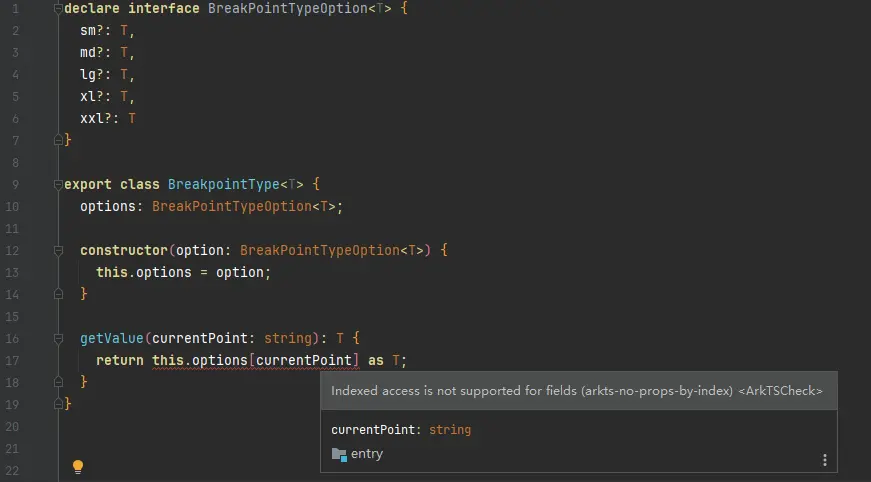 动态调用类或者接口的字段,导致编译报错出现:Indexed access is not supported for fields(arkts-no-props-by-index)。