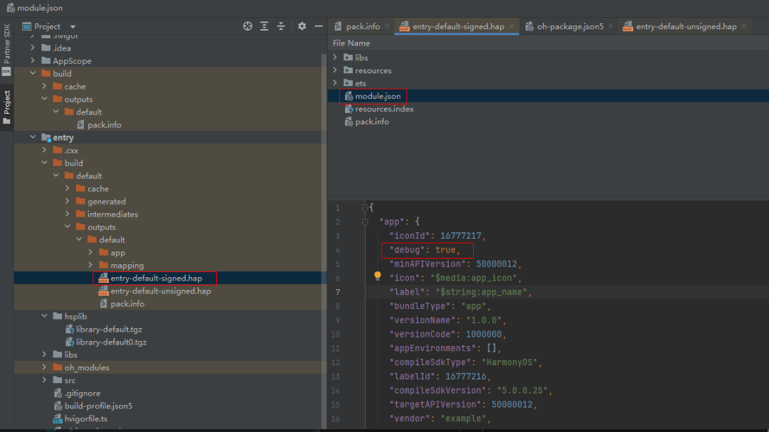 1.该debug字段由编译构建工具自动生成,保存在HAP/HSP包的module.json文件中,如下图所示,首先确认各模块间该字段是否一致。