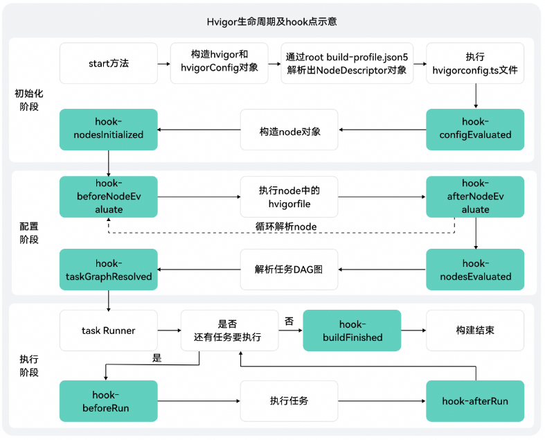 生命周期展示了Hvigor编译构建系统如何进行一次完整的编译构建流程。Hvigor的编译构建过程有三个不同的阶段,分为初始化、配置和执行,Hvigor会按顺序运行这些阶段。