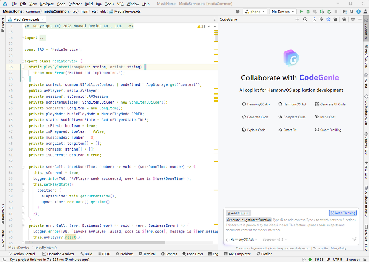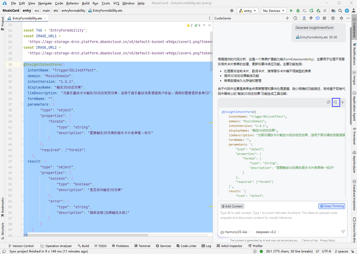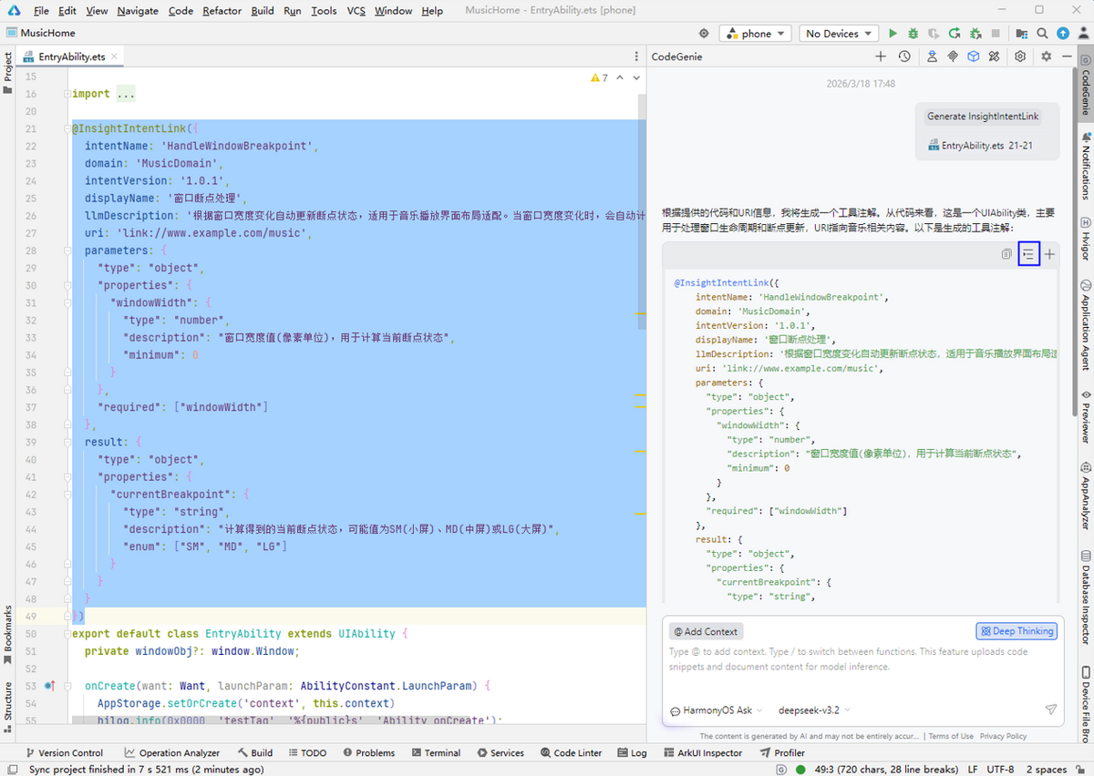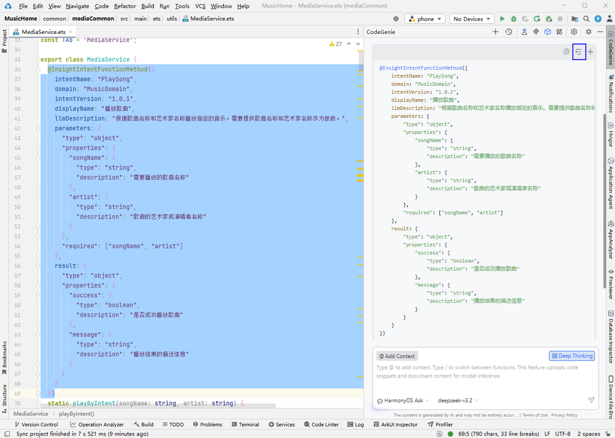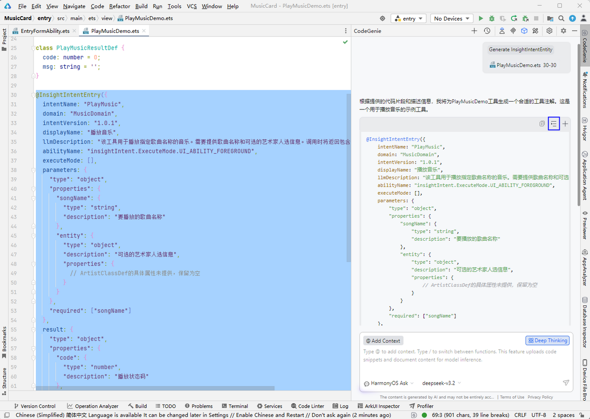 生成结果后,点击对话框中生成代码块右上方的插入按钮,在class上方插入@InsightIntentFunction,在class内部插入@InsightIntentFunctionMethod生成内容。开发者可基于结果微调,实现意图调用。