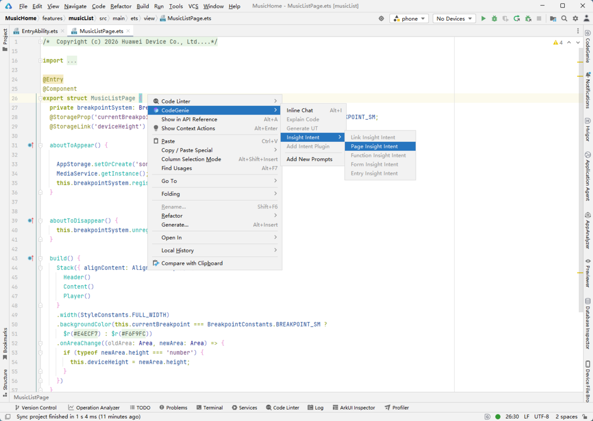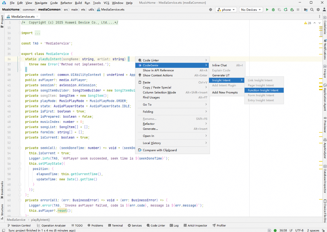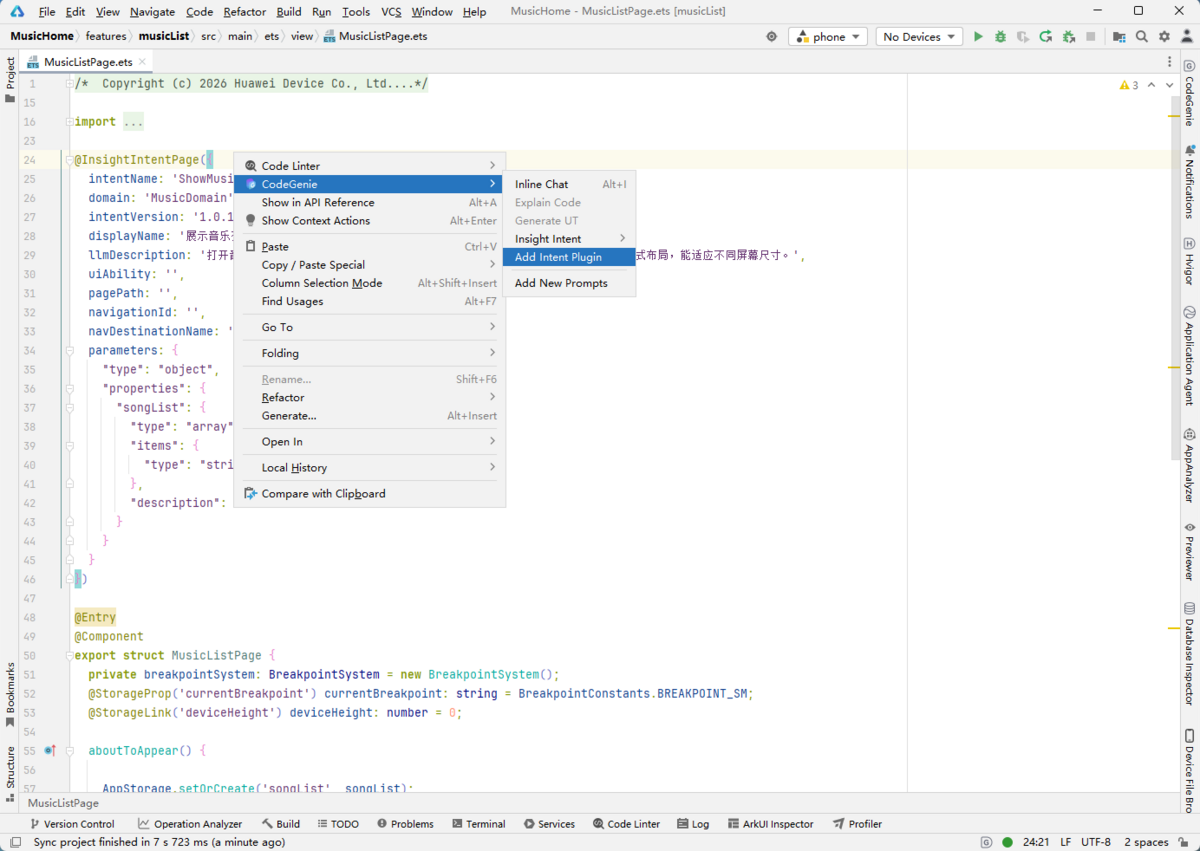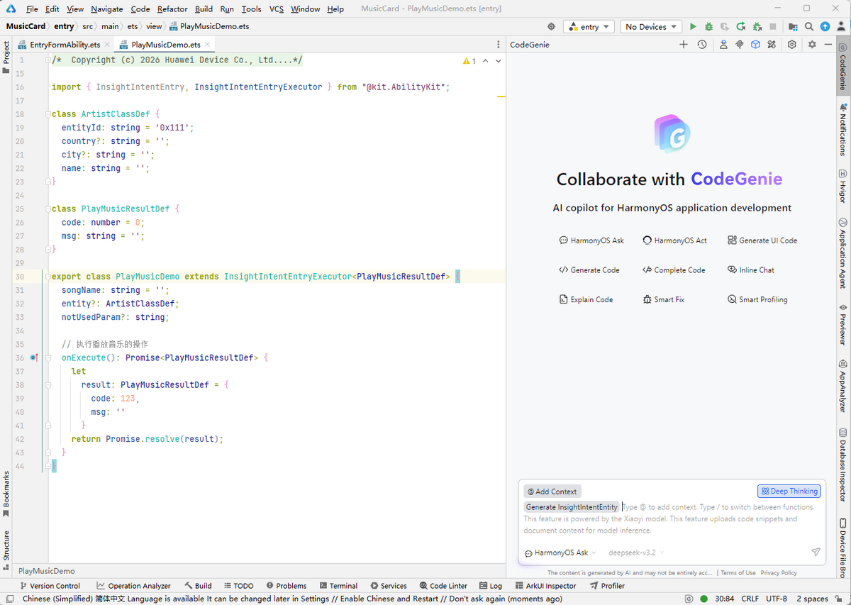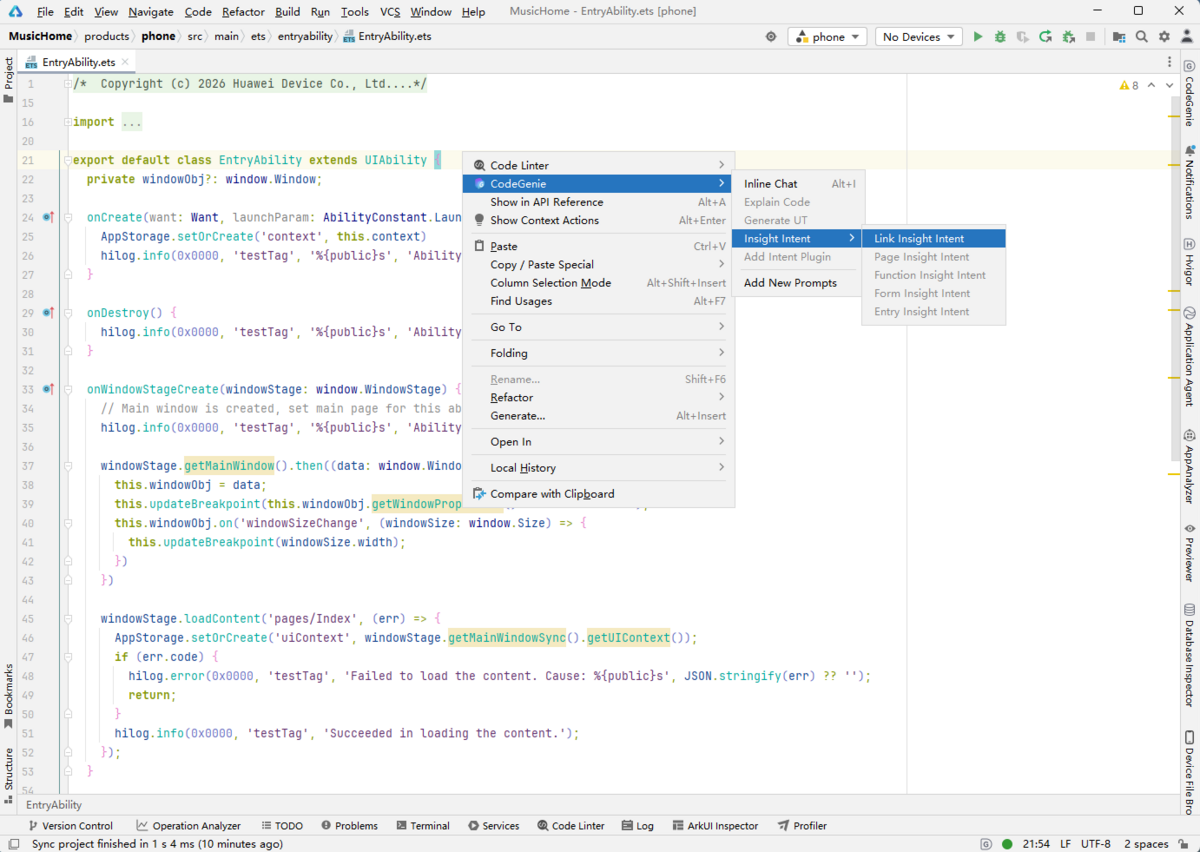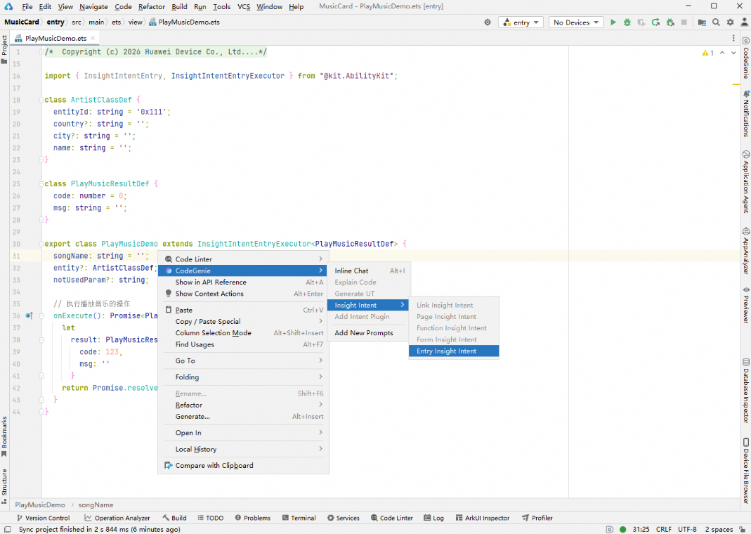 基于InsightIntentEntryExecutor使用,在直接继承InsightIntentEntryExecutor的class头部或内部,右键选择CodeGenie > Insight Intent > Entry Insight Intent。