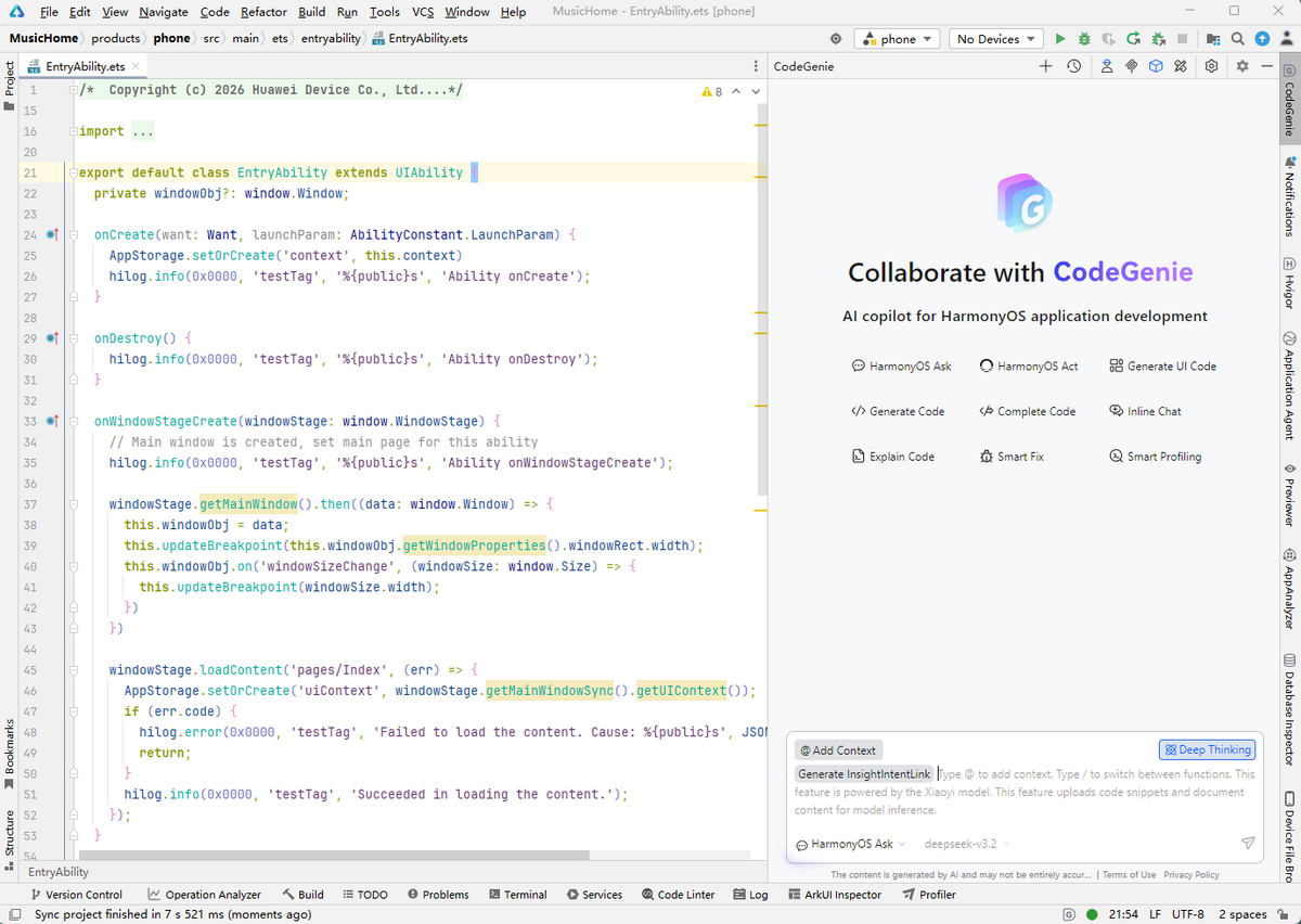 从DevEco Studio 6.0.0 Beta2开始,CodeGenie新增通过装饰器开发意图的功能,支持生成五类意图装饰器。同时,DevEco Studio新增Application Agent入口,通过该入口可完成意图插件注册、智能体创建等,提升开发效率。
