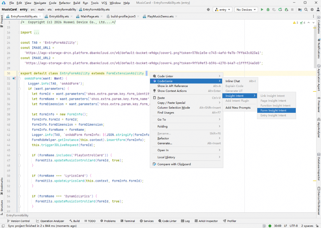 基于FormExtensionAbility使用,在继承FormExtensionAbility的class头部或内部,右键选择CodeGenie > Insight Intent > Form Insight Intent。