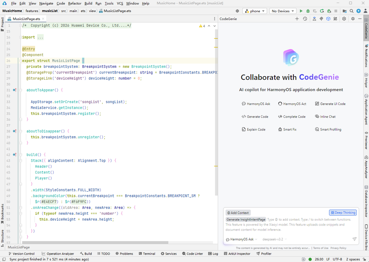 生成结果后,点击对话框中生成代码块右上方的插入按钮,在@Entry上方插入生成的代码。开发者可基于结果微调,实现意图调用。