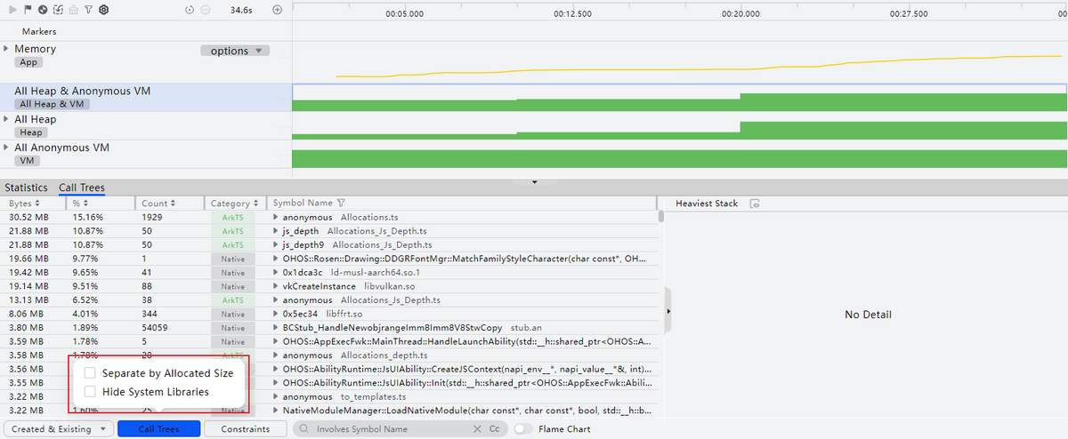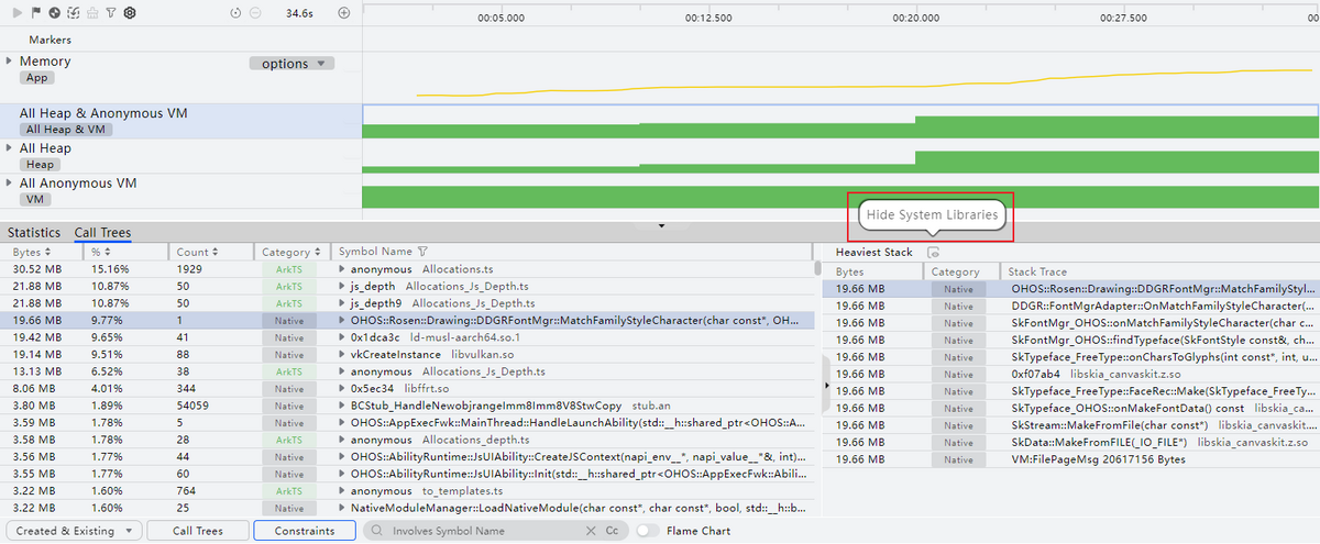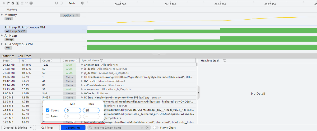 在All Heap & Anonymous VM泳道、All Heap泳道、All Anonymous VM泳道、System Resources泳道、Graphic Memory泳道的Call Trees页签中,可以通过底部的“Call Trees”和“Constraints”选择框筛选和过滤内存分配栈。