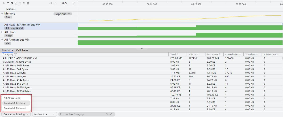 - Created & Existing:默认选中,详情区域展示当前框选时间段内分配未释放的内存。