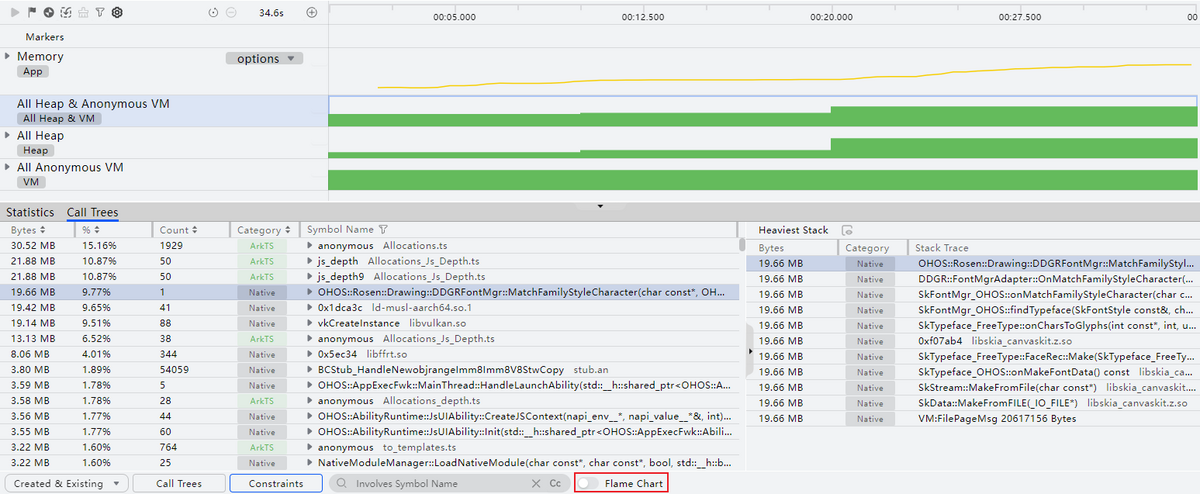 在Call Trees页签,可以通过底部的“Flame Chart”切换到火焰图视图。