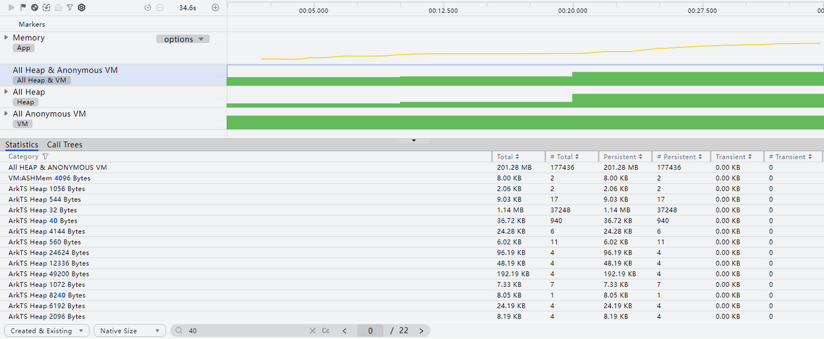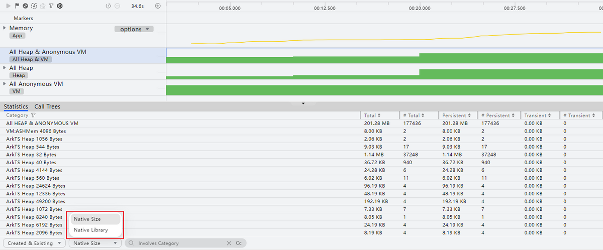 在All Heap & Anonymous VM泳道、All Heap泳道、All Anonymous VM泳道、System Resources泳道、Graphic Memory泳道的“Statistics”页签中,可以打开“Native Size”选择统计方式以过滤统计数据: