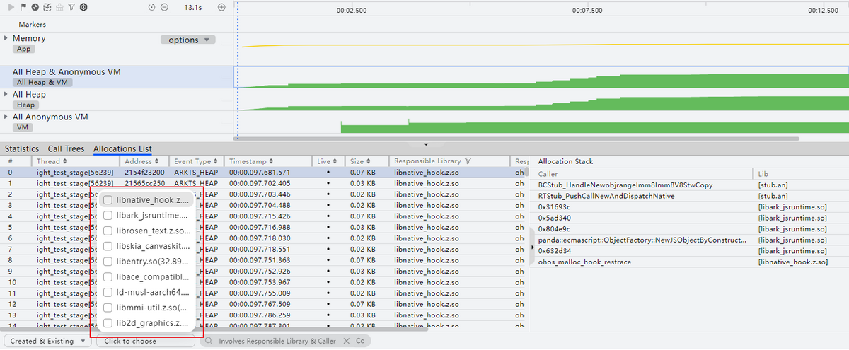 非统计模式下,在All Heap & Anonymous VM泳道、All Heap泳道、All Anonymous VM泳道、System Resources泳道、Graphic Memory泳道的“Allocations List”页签中,可以单击“Click to choose”选择要筛选的so库以过滤出与目标so库相关的数据: