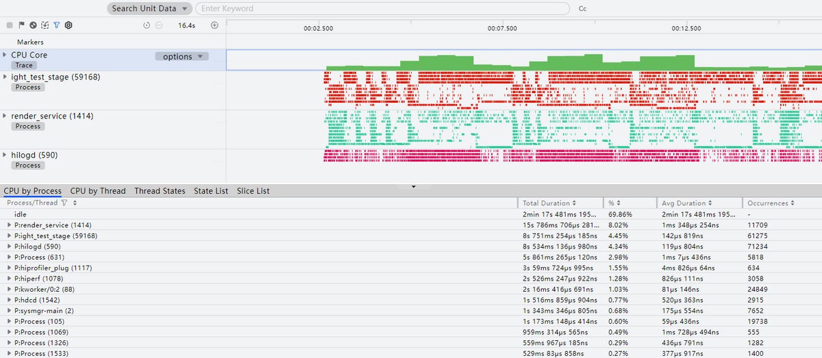 开发者可使用DevEco Profiler的CPU场景调优分析,在应用或元服务运行时,实时显示CPU使用率和线程的运行状态,了解指定时间段内的CPU资源消耗情况,查看系统的关键打点(例如图形系统打点、应用服务框架打点等),进行更具针对性的优化。