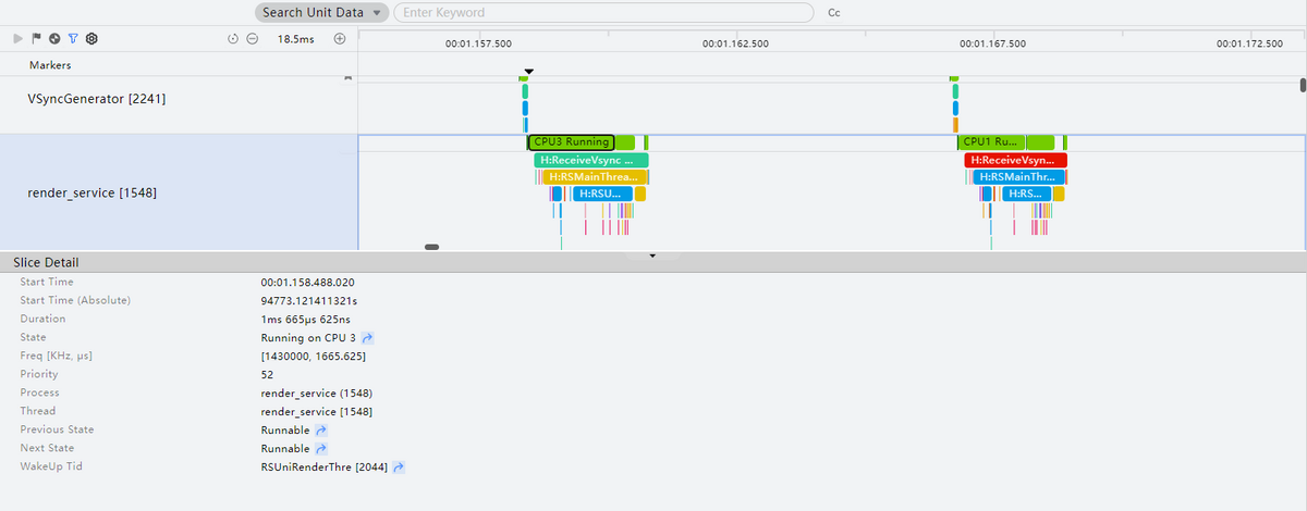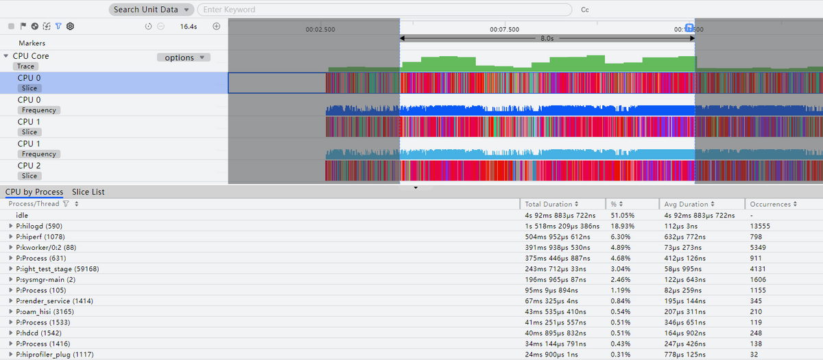 - Slice and Frequency:每个子泳道包含时间片和频率两部分,时间片显示占用该CPU核心的进程、线程。