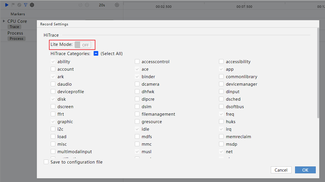 单击工具控制栏中的按钮,可以设置是否为精简模式。精简模式下,trace数据量将大幅减少,主要采集当前进程、大桌面进程和render_service进程的trace数据。