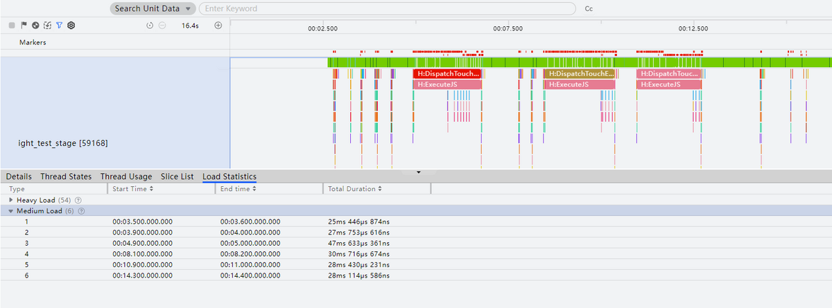框选Thread泳道中多个运行状态的时间片,可查看此时间段内的不同运行状态的线程的统计信息,包括总耗时时长、最大耗时、最小耗时、平均耗时、处于当前状态的线程数量以及线程中的中载和重载数据统计。
