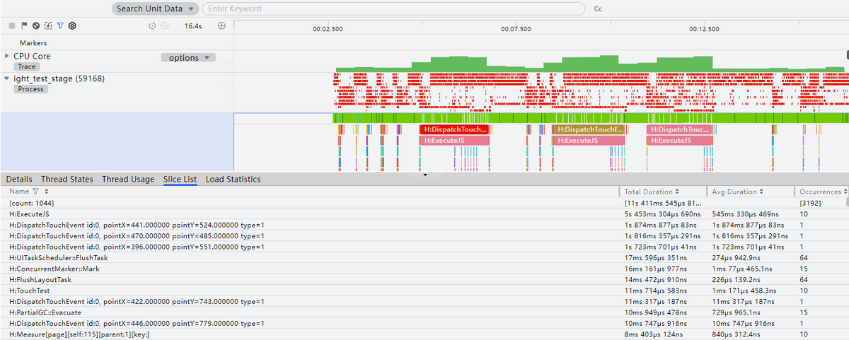 框选主泳道,可对所选时间段内的CPU使用情况进行汇总统计,可查询多时间片的进程维度统计信息、线程维度状态统计信息、线程状态统计信息,以及所有时间片的数据统计信息。