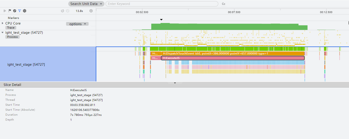 点选泳道中的Trace片段,可查看单个Trace详情,包括名称、所属进程、所属线程、起始时间、持续时长、深度等。