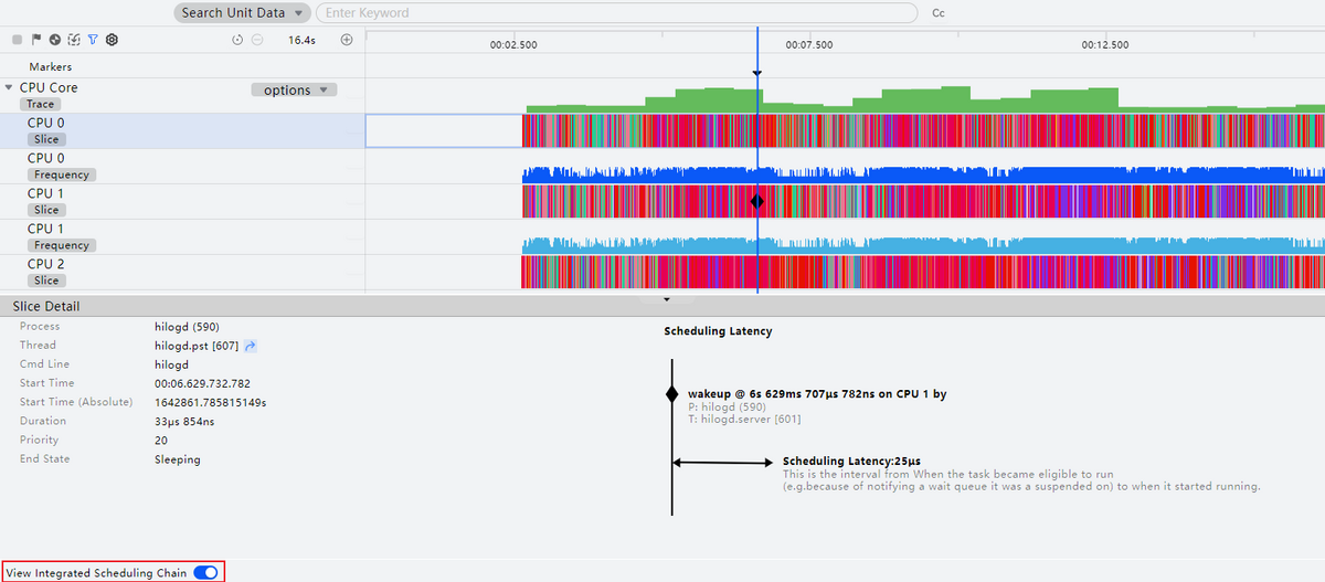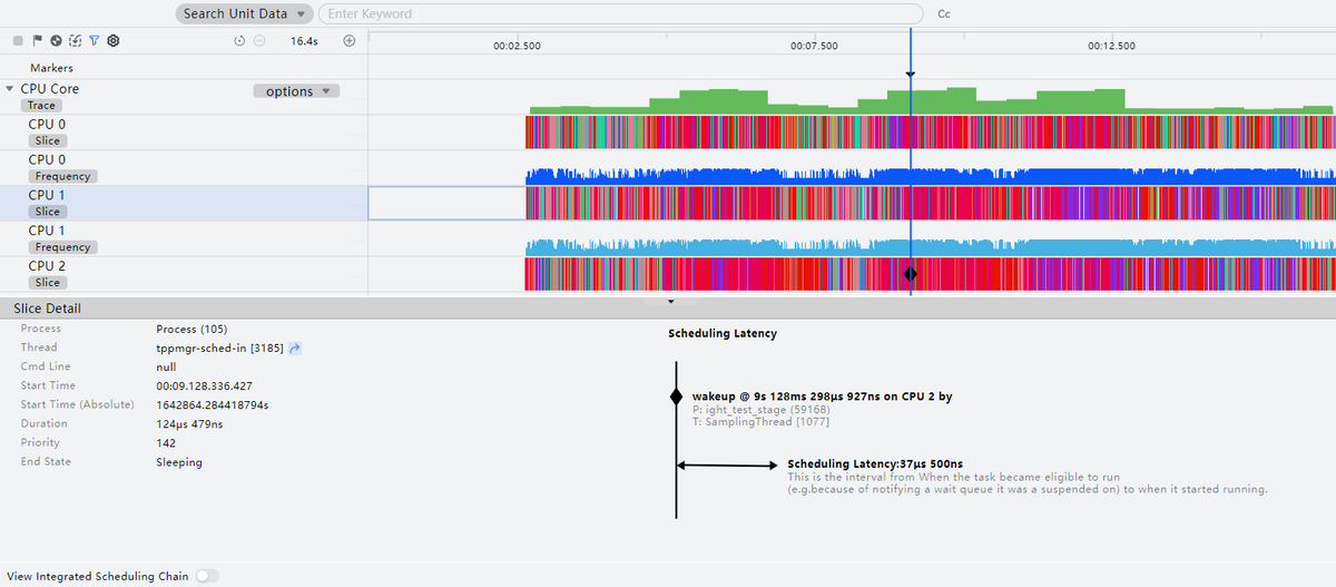 开启"View Integrated Scheduling Chain"后,点击CPU时间片泳道的节点可以查看某一个CPU运行线程的完整唤醒调度链。