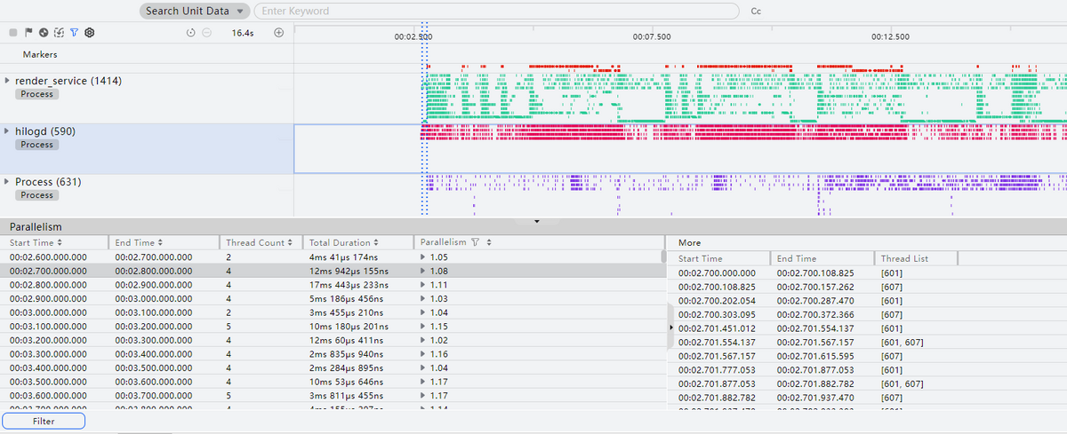 框选应用进程Process主泳道,可查看此时间段内该进程下的线程并行度统计信息。并行度数据每100ms做一次统计,可以查看100ms内运行的总线程数量、各线程并行的总时间和并行度。点选某一行,可以查看对应线程编号和运行时间段。