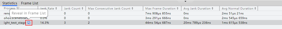 找到“Statistics”页签中存在卡顿帧的进程,点击进程名称后方跳转按钮,跳转到“Frame List”页签。