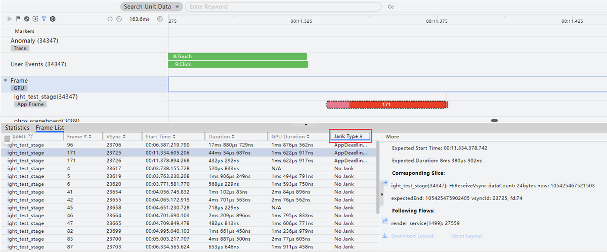 “Frame List”页签会展现该进程对应的Frame列表。在“Frame List”页签中对卡顿丢帧类型(Jank Type)进行升序排序,单击“Frame List”页签中任意一卡顿帧,直接跳转到该帧且泳道上该帧被反选。