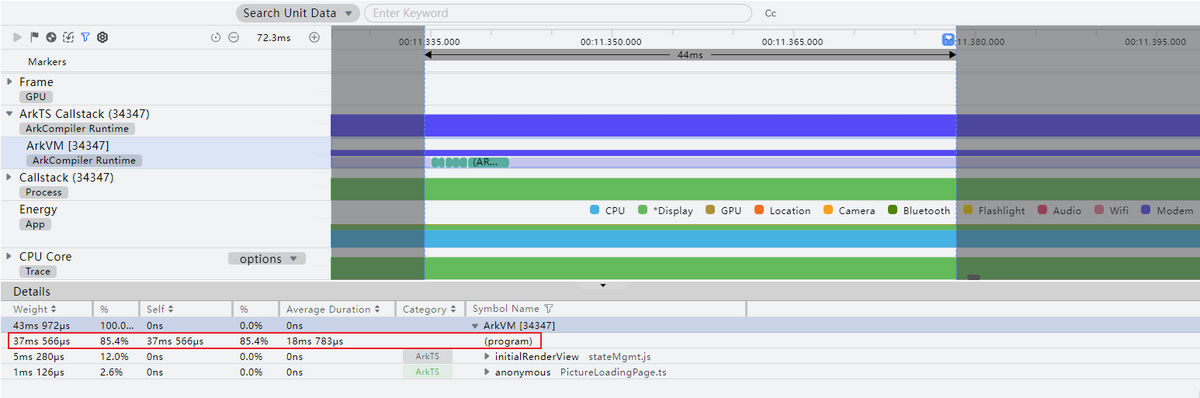 找到并框选要分析的异常帧,查看ArkTS Callstack泳道分析ArkTS侧耗时函数。优先查看主线程调用栈,即线程号与进程号一致的ArkVM子泳道。可以看到ArkTS侧一些方法的耗时。
