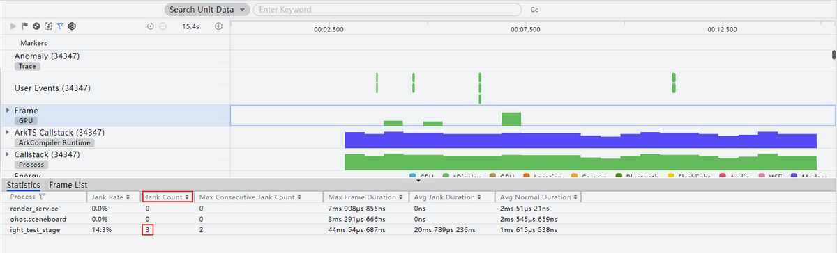 框选Frame泳道,窗口下方的“Statistics”区域中会以进程维度对选定时间段内的Frame信息进行统计,当Jank Count大于0时,说明存在卡顿帧。