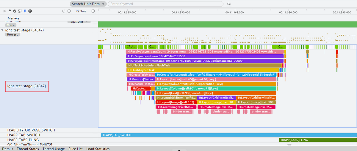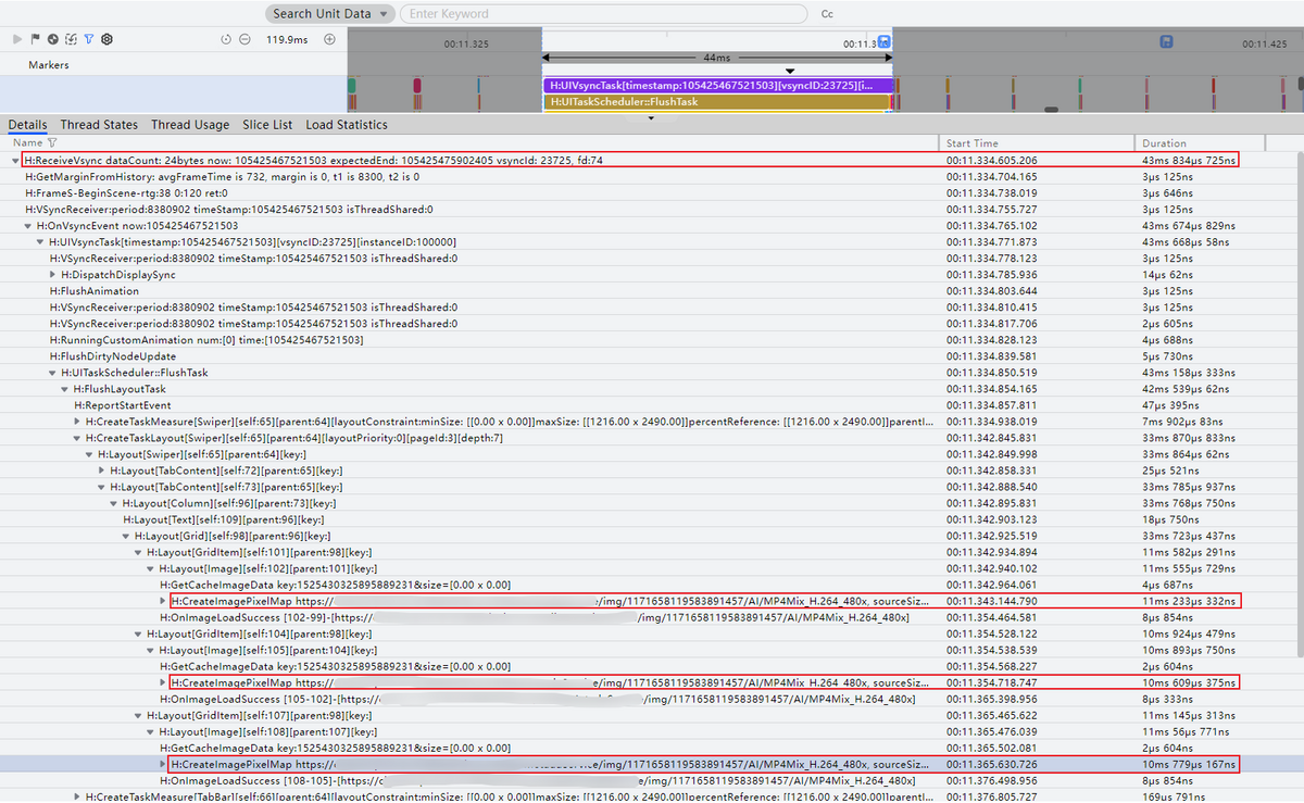窗口下方详情区可查看到Trace统计信息列表,逐层展开耗时最长的Trace,定位到主要耗时是在3次H:CreateImagePixelMap。接下来进一步分析这3次H:CreateImagePixelMap耗时的原因。