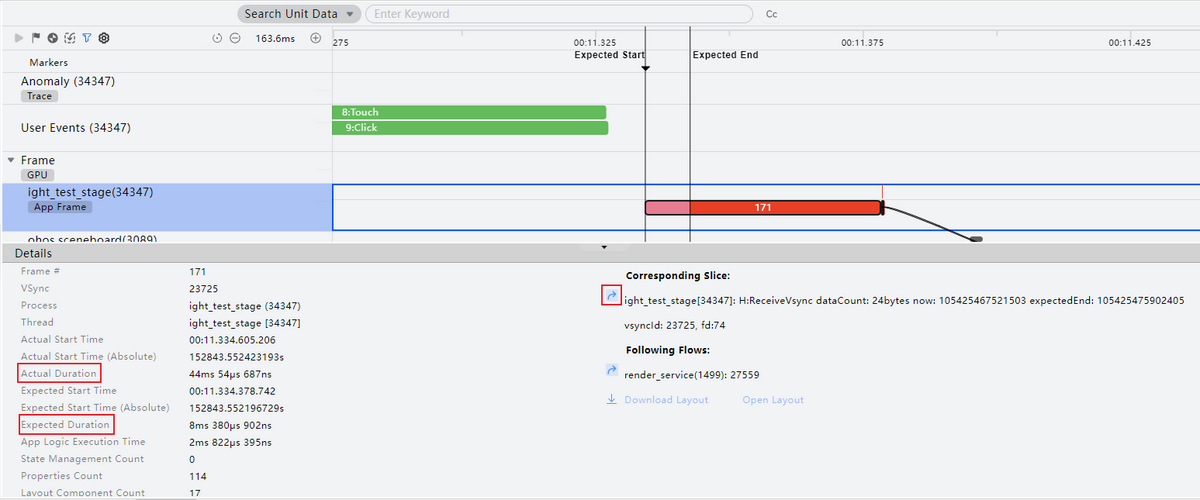 点选该卡顿帧,窗口下方的“Details”区域中显示卡顿帧的关键信息。右侧应用进程前方跳转按钮可以跳转到应用进程Trace。