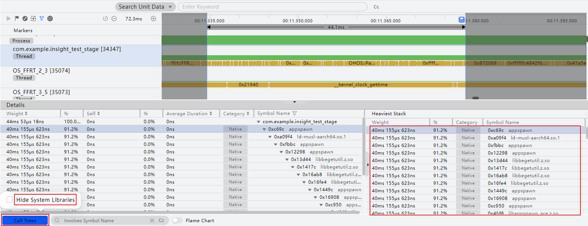 也可通过底部的“Call Trees”选择框来隐藏系统调用栈,减少干扰信息。