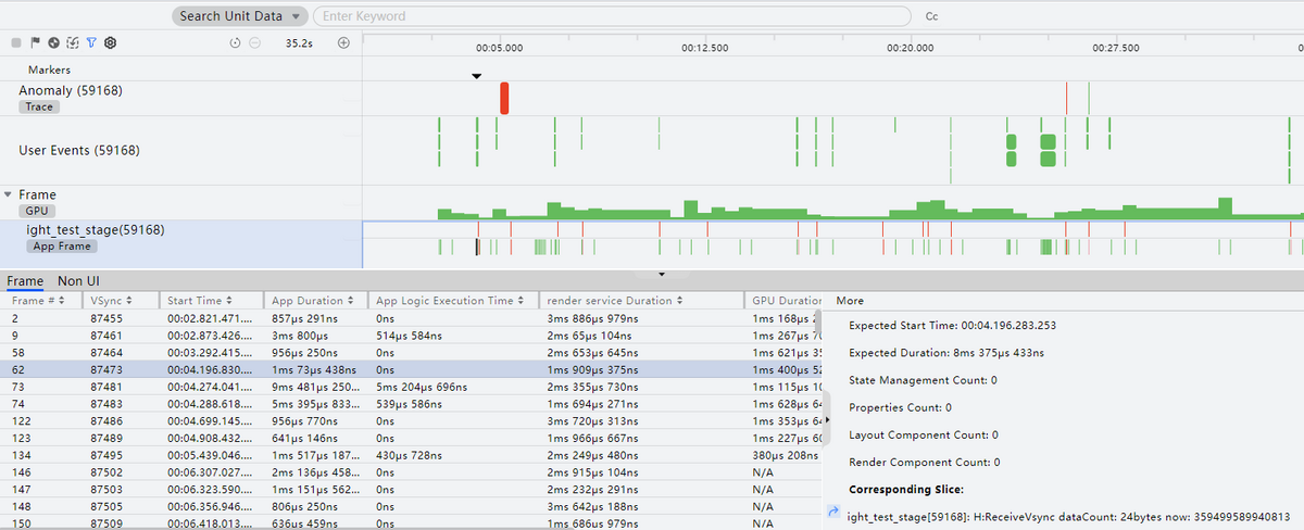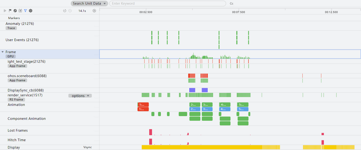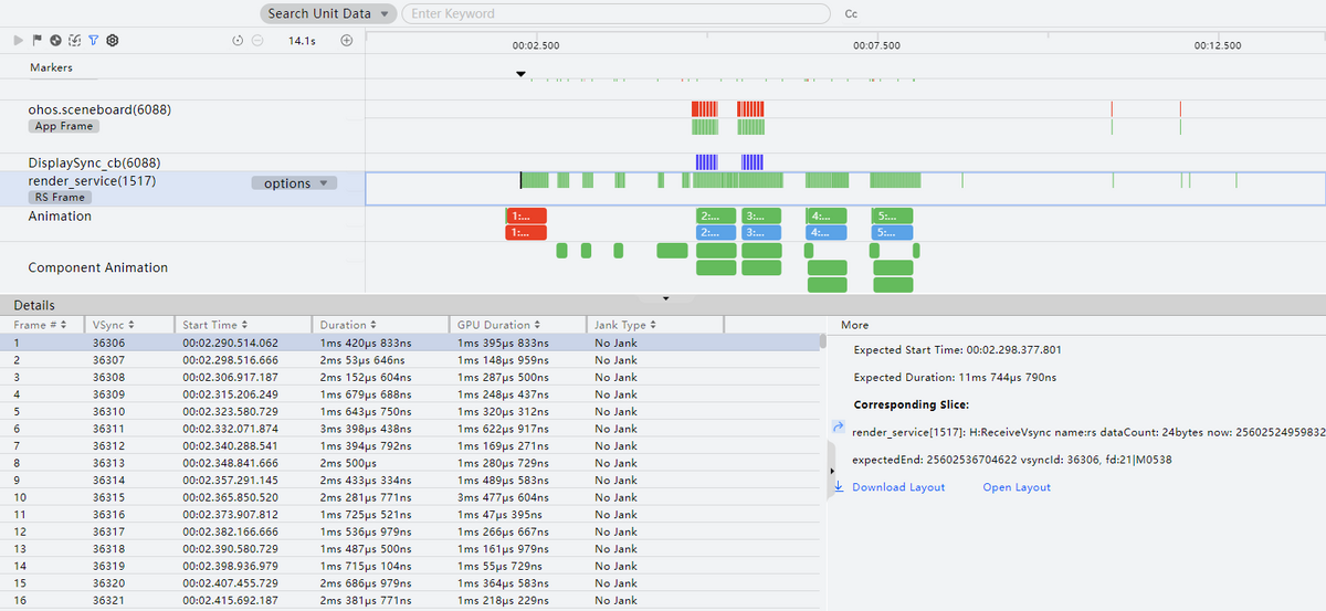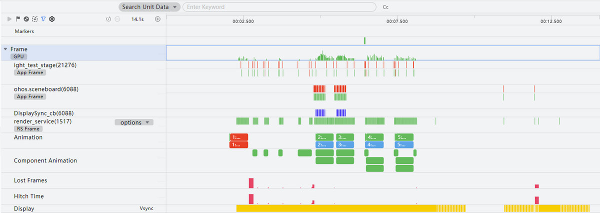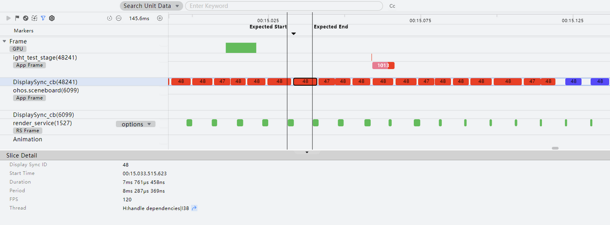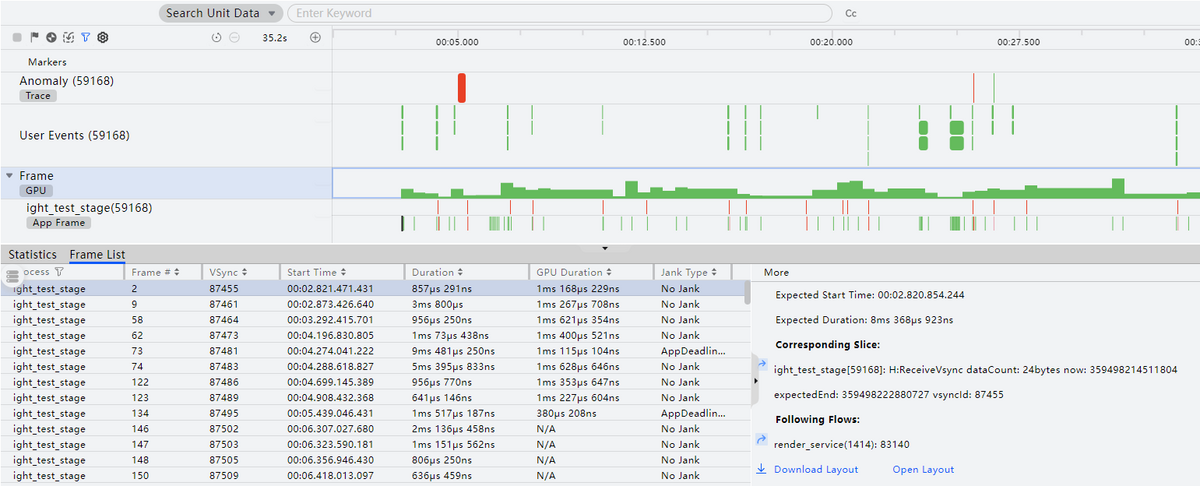 - 在“RS Frame”和“App Frame”标签的泳道中,正常完成渲染的帧显示为绿色,出现卡顿的帧显示为红色。