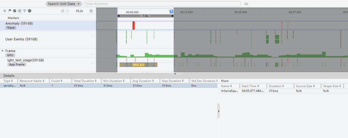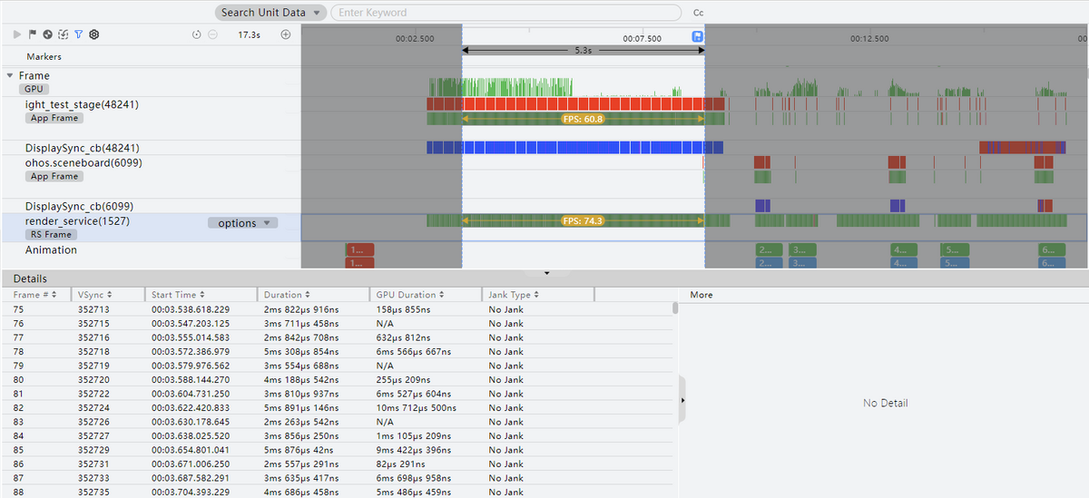 窗口下方的“Details”区域中会显示选定时间段内的RS帧统计信息列表,体现各帧的起始时间、总耗时、GPU耗时以及卡顿丢帧类型。