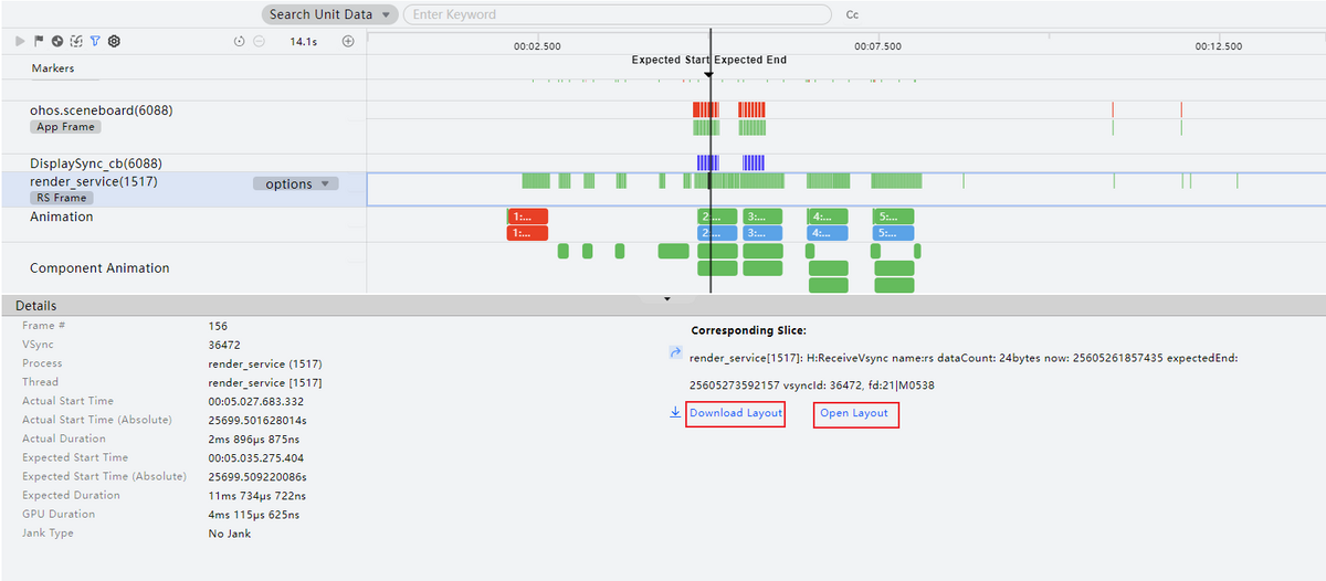 单击RS Frame泳道或APP Frame泳道中任意一帧,“Details”区域中会展示该帧具体信息。点击Open Layout按钮,将在ArkUI Inspector中直接打开相应arkli文件;点击Download Layout将arkli文件下载到指定目录,之后可手动导入ArkUI Inspector查看页面布局信息。
