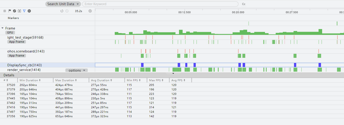 DisplaySync_cb(tid):该泳道显示对应组件的帧率,如DisplaySync、XComponent两类接口组件动画对应的帧率。调测时,不同场景下由于帧率可变,系统实际表现是否符合预期,需要有实际的检测手段。尤其是由于DisplaySync的渲染均在UI主线程执行,当存在多个需要渲染的组件需要同时执行时,只能在UI主线程排队,此时任何一个组件的延迟都会对其他组件的渲染产生影响,导致UI卡顿。