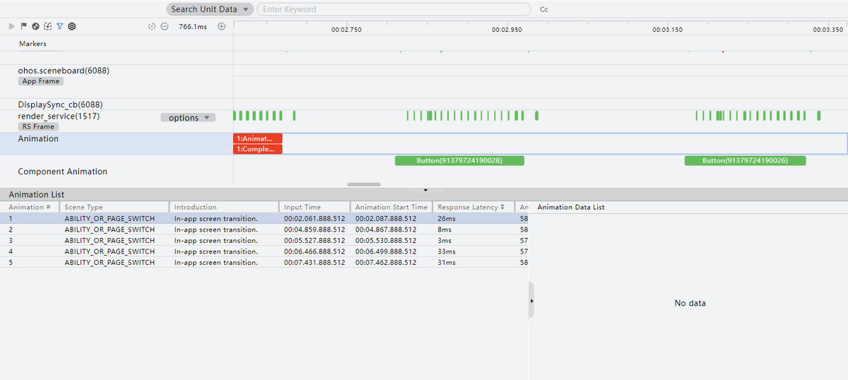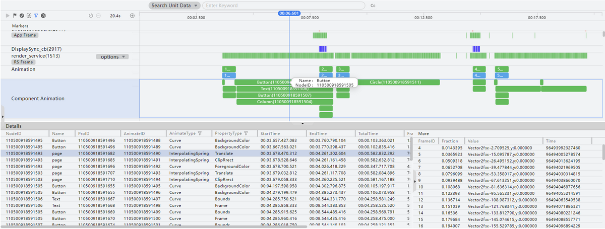 从DevEco Studio 6.0.0.828版本开始,Frame泳道下新增Component Animation子泳道,用于从组件的角度展示应用中包含的各种动画类型,包括属性动画 (animation)、显式动画 (animateTo)、关键帧动画 (keyframeAnimateTo)以及页面间转场 (pageTransition)。