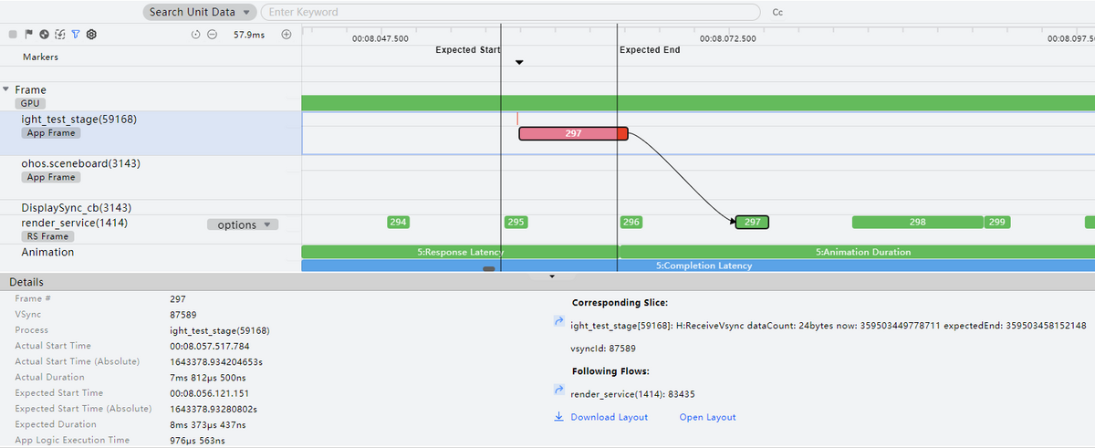 - 如果该帧是由于超出期望结束时间引起的,则显示两条线,对应期望开始时间(Expected Start)和期望结束时间(Expected End),用于关联分析同一时刻Trace或者函数采样信息。