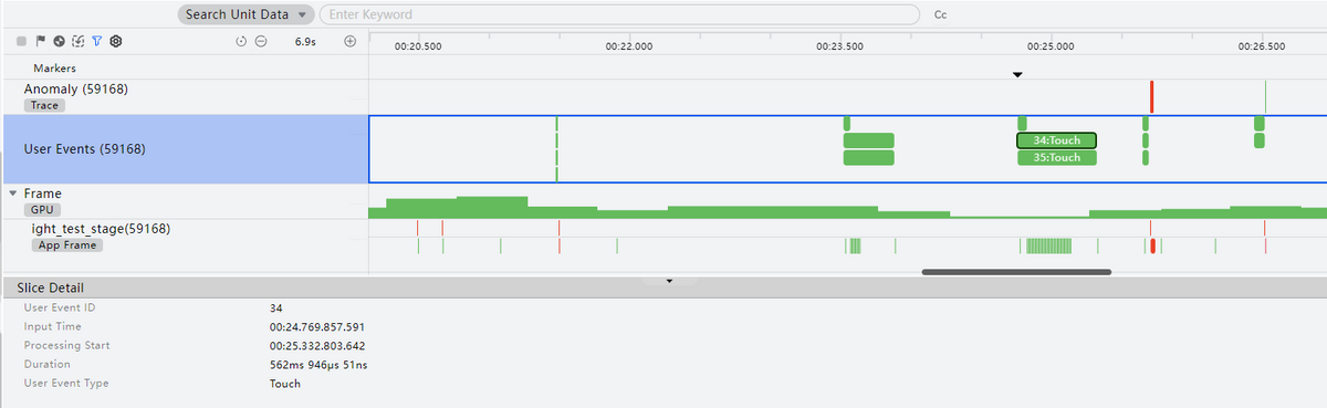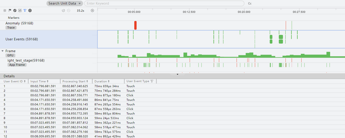 开发者在卡顿丢帧场景可通过User Event用户事件,查看用户事件开始时间、应用开始处理时间以及应用处理耗时等情况。