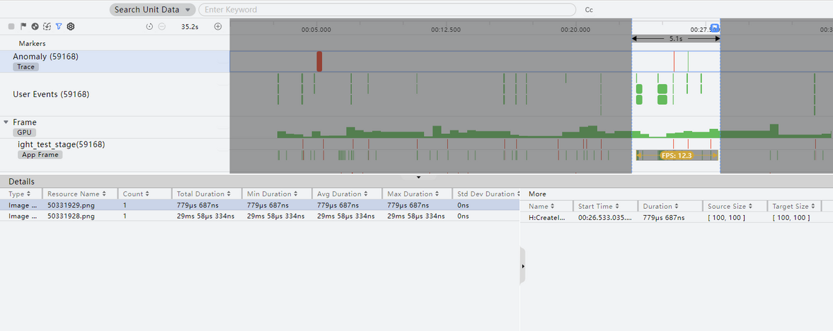 如果工程中存在图片资源,并感知到解码绘制/渲染过程存在卡顿,可以通过Anomaly泳道查看主线程解码过程中是否存在解码过度耗时告警,并确认发生告警的时段。