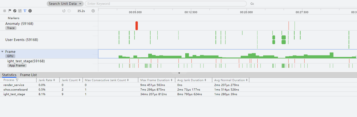 窗口下方的“Statistics”区域中会以进程维度对选定时间段内的Frame信息进行统计,包括卡顿率、卡顿次数、最大连续卡顿次数、最大卡顿耗时、平均卡顿耗时以及平均正常耗时等。