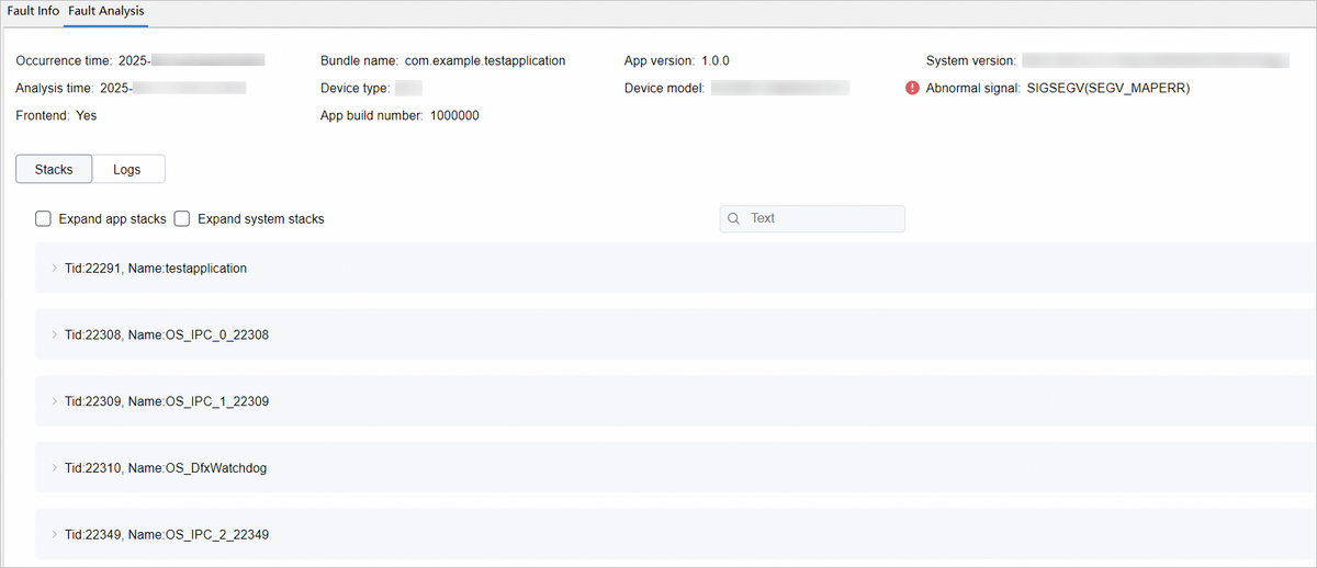 - Logs:展示FaultLog中的HiLog日志,使用方式和cppcrash日志相同,具体请参考查看HiLog日志。