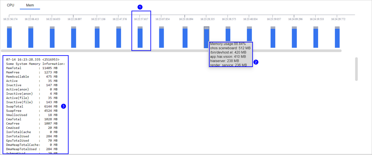 ①:柱状图表示对应时间点的内存使用情况(百分比)。