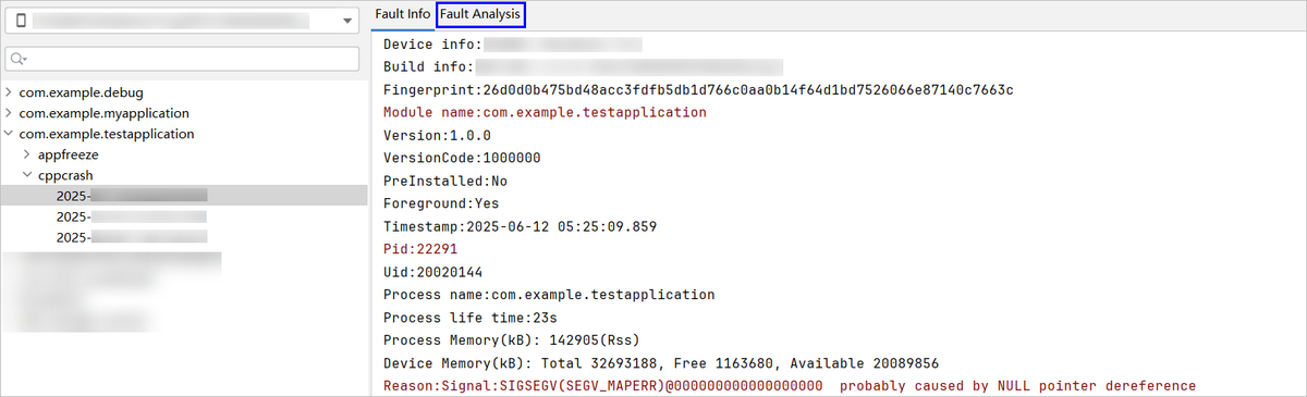 FaultLog故障信息左侧按照应用/元服务包名 > 故障类型 > 故障时间结构组成,选中具体的故障日期,则会在右侧展示详细的故障信息,并对部分关键信息进行高亮展示,便于开发者进行故障定位。