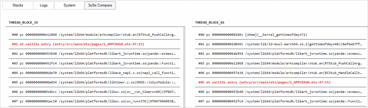 从DevEco Studio 6.0.2 Beta1版本开始,新增3s/6s Compare页签,用于对THREAD_BLOCK_6S类型的AppFreeze问题,展示3s和6s时间点的主线程堆栈日志,并标识栈帧中可能的故障处。