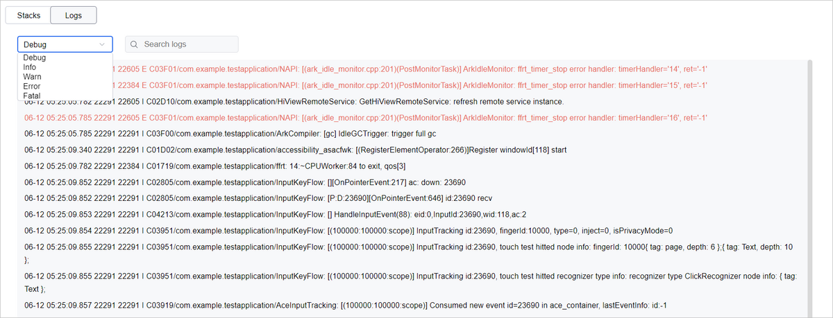 Logs页签用于查看appfreeze中的HiLog,使用方式和cppcrash日志相同,具体请参考查看HiLog日志。