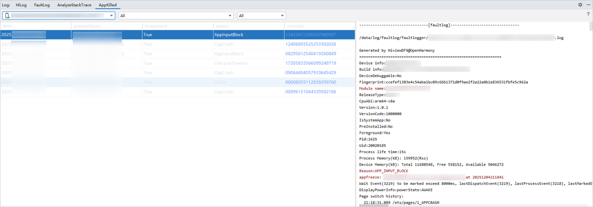 从DevEco Studio 6.0.2 Beta1版本开始,提供AppKilled窗口,用于查看设备上应用终止的相关信息,包括应用异常退出的时间、进程名、是否前台应用、异常退出原因,点击recordId可以查看详细的FaultLog信息。支持按设备、应用和异常原因对信息进行过滤。