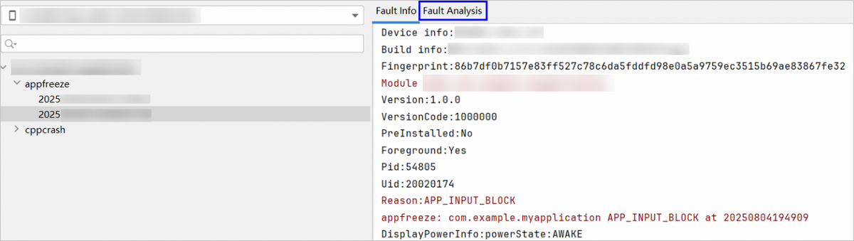 双击appfreeze日志,Fault Info右侧会出现Fault Analysis页签。