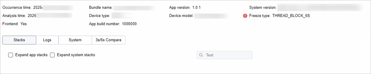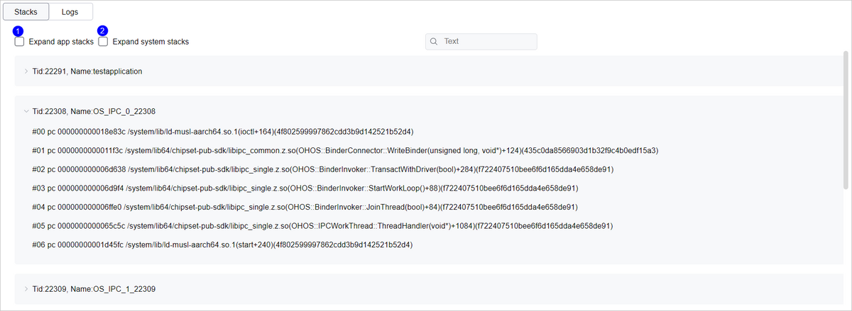 Stacks页签用于查看appfreeze中的堆栈信息,使用方式和cppcrash日志相同,具体请参考查看堆栈信息。