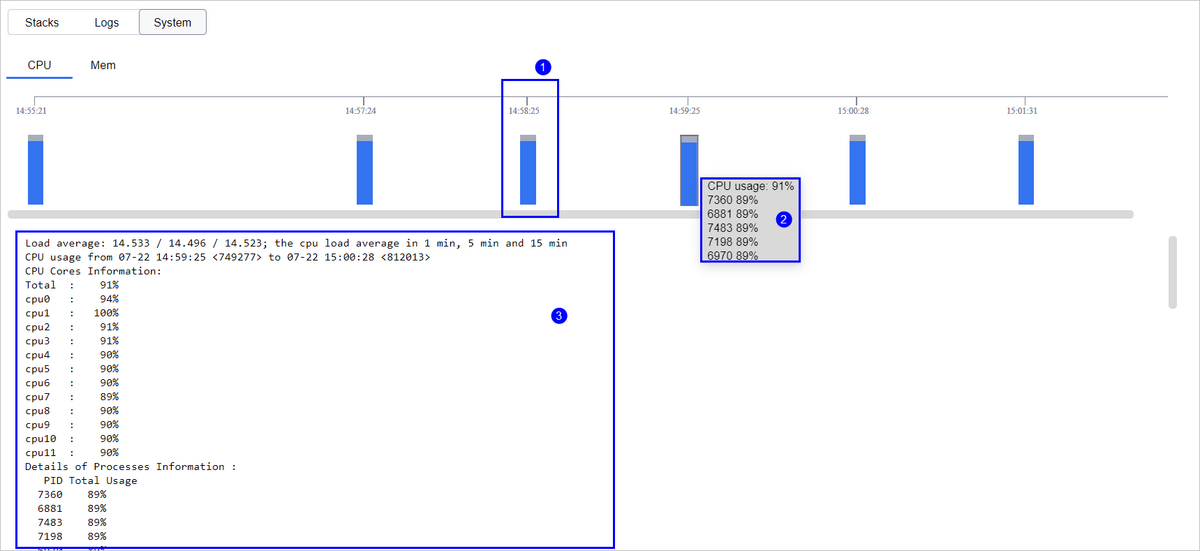 ①:柱状图表示对应时间点的CPU使用情况(百分比)。